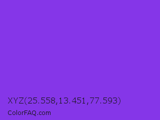 XYZ 25.558,13.451,77.593 Color is a normal violet color and the nearest color is Blue Violet #8a2be2. Hex code #8536e8 and RGB value is rgb(133,54,232). In RGB color space, this color is composed of 52% red, 21% green, 91% blue, In CMYK color space, this color is composed of 43% cyan, 77% magenta, 0% yellow , 9% black , In HSL color space, this color has a hue angle of 267° , 79% saturation and 56% lightness.