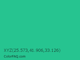 XYZ 25.573,41.906,33.126 Color is a normal green color and the nearest color is Mountain Meadow #30ba8f. Hex code #26c490 and RGB value is rgb(38,196,144). In RGB color space, this color is composed of 15% red, 77% green, 56% blue, In CMYK color space, this color is composed of 81% cyan, 0% magenta, 27% yellow , 23% black , In HSL color space, this color has a hue angle of 160° , 68% saturation and 46% lightness.