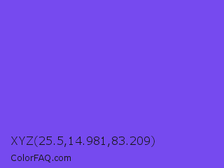 XYZ 25.5,14.981,83.209 Color is a light indigo color and the nearest color is Majorelle Blue #6050dc. Hex code #764aef and RGB value is rgb(118,74,239). In RGB color space, this color is composed of 46% red, 29% green, 94% blue, In CMYK color space, this color is composed of 51% cyan, 69% magenta, 0% yellow , 6% black , In HSL color space, this color has a hue angle of 256° , 84% saturation and 61% lightness.
