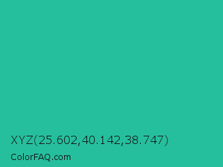 XYZ 25.602,40.142,38.747 Color is a normal cyan color and the nearest color is Light Sea Green #20b2aa. Hex code #26bf9e and RGB value is rgb(38,191,158). In RGB color space, this color is composed of 15% red, 75% green, 62% blue, In CMYK color space, this color is composed of 80% cyan, 0% magenta, 17% yellow , 25% black , In HSL color space, this color has a hue angle of 167° , 67% saturation and 45% lightness.
