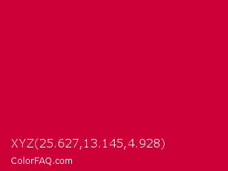 XYZ 25.627,13.145,4.928 Color is a normal rose color and the nearest color is Vivid Crimson #cc0033. Hex code #cc0138 and RGB value is rgb(204,1,56). In RGB color space, this color is composed of 80% red, 0% green, 22% blue, In CMYK color space, this color is composed of 0% cyan, 100% magenta, 73% yellow , 20% black , In HSL color space, this color has a hue angle of 344° , 99% saturation and 40% lightness.