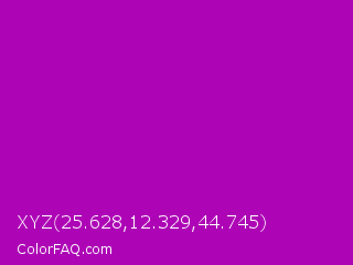 XYZ 25.628,12.329,44.745 Color is a normal magenta color and the nearest color is Heliotrope Magenta #aa00bb. Hex code #ad05b5 and RGB value is rgb(173,5,181). In RGB color space, this color is composed of 68% red, 2% green, 71% blue, In CMYK color space, this color is composed of 4% cyan, 97% magenta, 0% yellow , 29% black , In HSL color space, this color has a hue angle of 297° , 95% saturation and 36% lightness.