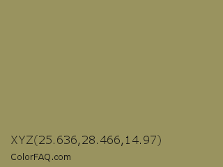 XYZ 25.636,28.466,14.97 Color is a normal yellow color and the nearest color is Barley Corn #a68b5b. Hex code #99935f and RGB value is rgb(153,147,95). In RGB color space, this color is composed of 60% red, 58% green, 37% blue, In CMYK color space, this color is composed of 0% cyan, 4% magenta, 38% yellow , 40% black , In HSL color space, this color has a hue angle of 54° , 23% saturation and 49% lightness.