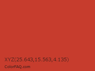 XYZ 25.643,15.563,4.135 Color is a normal red color and the nearest color is International Orange Golden Gate Bridge #c0362c. Hex code #c73c2d and RGB value is rgb(199,60,45). In RGB color space, this color is composed of 78% red, 24% green, 18% blue, In CMYK color space, this color is composed of 0% cyan, 70% magenta, 77% yellow , 22% black , In HSL color space, this color has a hue angle of 6° , 63% saturation and 48% lightness.