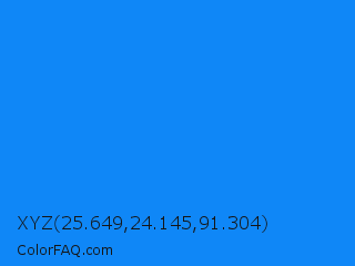 XYZ 25.649,24.145,91.304 Color is a normal blue color and the nearest color is Azure Radiance #007fff. Hex code #0f87f7 and RGB value is rgb(15,135,247). In RGB color space, this color is composed of 6% red, 53% green, 97% blue, In CMYK color space, this color is composed of 94% cyan, 45% magenta, 0% yellow , 3% black , In HSL color space, this color has a hue angle of 209° , 94% saturation and 51% lightness.