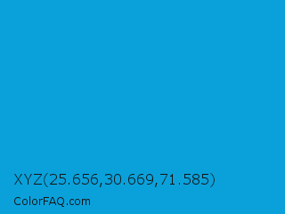 XYZ 25.656,30.669,71.585 Color is a normal blue color and the nearest color is Cerulean #02a4d3. Hex code #0aa1db and RGB value is rgb(10,161,219). In RGB color space, this color is composed of 4% red, 63% green, 86% blue, In CMYK color space, this color is composed of 95% cyan, 26% magenta, 0% yellow , 14% black , In HSL color space, this color has a hue angle of 197° , 91% saturation and 45% lightness.