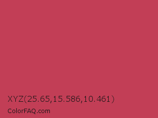 XYZ 25.65,15.586,10.461 Color is a normal red color and the nearest color is Brick Red #cb4154. Hex code #c23e56 and RGB value is rgb(194,62,86). In RGB color space, this color is composed of 76% red, 24% green, 34% blue, In CMYK color space, this color is composed of 0% cyan, 68% magenta, 56% yellow , 24% black , In HSL color space, this color has a hue angle of 349° , 52% saturation and 50% lightness.