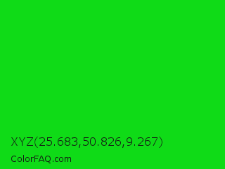 XYZ 25.683,50.826,9.267 Color is a normal green color and the nearest color is Vivid Malachite #00cc33. Hex code #0fdb17 and RGB value is rgb(15,219,23). In RGB color space, this color is composed of 6% red, 86% green, 9% blue, In CMYK color space, this color is composed of 93% cyan, 0% magenta, 89% yellow , 14% black , In HSL color space, this color has a hue angle of 122° , 87% saturation and 46% lightness.