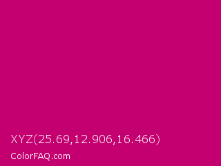 XYZ 25.69,12.906,16.466 Color is a normal magenta color and the nearest color is Lipstick #ab0563. Hex code #c40070 and RGB value is rgb(196,0,112). In RGB color space, this color is composed of 77% red, 0% green, 44% blue, In CMYK color space, this color is composed of 0% cyan, 100% magenta, 43% yellow , 23% black , In HSL color space, this color has a hue angle of 326° , 100% saturation and 38% lightness.