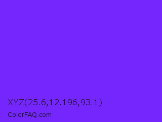XYZ 25.6,12.196,93.1 Color is a normal violet color and the nearest color is Blue Violet #8a2be2. Hex code #7526fc and RGB value is rgb(117,38,252). In RGB color space, this color is composed of 46% red, 15% green, 99% blue, In CMYK color space, this color is composed of 54% cyan, 85% magenta, 0% yellow , 1% black , In HSL color space, this color has a hue angle of 262° , 97% saturation and 57% lightness.