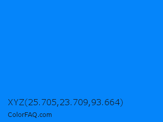 XYZ 25.705,23.709,93.664 Color is a normal blue color and the nearest color is Azure Radiance #007fff. Hex code #0585fa and RGB value is rgb(5,133,250). In RGB color space, this color is composed of 2% red, 52% green, 98% blue, In CMYK color space, this color is composed of 98% cyan, 47% magenta, 0% yellow , 2% black , In HSL color space, this color has a hue angle of 209° , 96% saturation and 50% lightness.