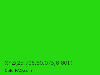 XYZ 25.706,50.075,8.801 Color is a normal green color and the nearest color is Harlequin Green #46cb18. Hex code #26d910 and RGB value is rgb(38,217,16). In RGB color space, this color is composed of 15% red, 85% green, 6% blue, In CMYK color space, this color is composed of 82% cyan, 0% magenta, 93% yellow , 15% black , In HSL color space, this color has a hue angle of 113° , 86% saturation and 46% lightness.
