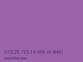 XYZ 25.715,19.009,41.849 Color is a normal purple color and the nearest color is Wisteria #9771b5. Hex code #9c63ad and RGB value is rgb(156,99,173). In RGB color space, this color is composed of 61% red, 39% green, 68% blue, In CMYK color space, this color is composed of 10% cyan, 43% magenta, 0% yellow , 32% black , In HSL color space, this color has a hue angle of 286° , 31% saturation and 53% lightness.