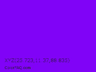 XYZ 25.723,11.37,88.835 Color is a normal purple color and the nearest color is Violet Color Wheel #7f00ff. Hex code #8003f7 and RGB value is rgb(128,3,247). In RGB color space, this color is composed of 50% red, 1% green, 97% blue, In CMYK color space, this color is composed of 48% cyan, 99% magenta, 0% yellow , 3% black , In HSL color space, this color has a hue angle of 271° , 98% saturation and 49% lightness.