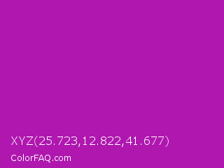 XYZ 25.723,12.822,41.677 Color is a normal magenta color and the nearest color is Heliotrope Magenta #aa00bb. Hex code #af17af and RGB value is rgb(175,23,175). In RGB color space, this color is composed of 69% red, 9% green, 69% blue, In CMYK color space, this color is composed of 0% cyan, 87% magenta, 0% yellow , 31% black , In HSL color space, this color has a hue angle of 300° , 77% saturation and 39% lightness.