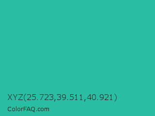 XYZ 25.723,39.511,40.921 Color is a normal cyan color and the nearest color is Light Sea Green #20b2aa. Hex code #29bda3 and RGB value is rgb(41,189,163). In RGB color space, this color is composed of 16% red, 74% green, 64% blue, In CMYK color space, this color is composed of 78% cyan, 0% magenta, 14% yellow , 26% black , In HSL color space, this color has a hue angle of 169° , 64% saturation and 45% lightness.