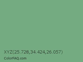 XYZ 25.728,34.424,26.057 Color is a normal green color and the nearest color is Amulet #7b9f80. Hex code #74ab81 and RGB value is rgb(116,171,129). In RGB color space, this color is composed of 45% red, 67% green, 51% blue, In CMYK color space, this color is composed of 32% cyan, 0% magenta, 25% yellow , 33% black , In HSL color space, this color has a hue angle of 134° , 25% saturation and 56% lightness.
