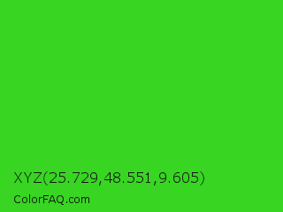 XYZ 25.729,48.551,9.605 Color is a normal green color and the nearest color is Lime Green #32cd32. Hex code #38d523 and RGB value is rgb(56,213,35). In RGB color space, this color is composed of 22% red, 84% green, 14% blue, In CMYK color space, this color is composed of 74% cyan, 0% magenta, 84% yellow , 16% black , In HSL color space, this color has a hue angle of 113° , 72% saturation and 49% lightness.