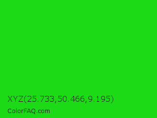 XYZ 25.733,50.466,9.195 Color is a normal green color and the nearest color is Lime Green #32cd32. Hex code #1dda17 and RGB value is rgb(29,218,23). In RGB color space, this color is composed of 11% red, 85% green, 9% blue, In CMYK color space, this color is composed of 87% cyan, 0% magenta, 89% yellow , 15% black , In HSL color space, this color has a hue angle of 118° , 81% saturation and 47% lightness.
