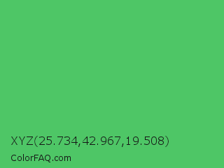 XYZ 25.734,42.967,19.508 Color is a normal green color and the nearest color is Emerald #50c878. Hex code #4ec666 and RGB value is rgb(78,198,102). In RGB color space, this color is composed of 31% red, 78% green, 40% blue, In CMYK color space, this color is composed of 61% cyan, 0% magenta, 48% yellow , 22% black , In HSL color space, this color has a hue angle of 132° , 51% saturation and 54% lightness.