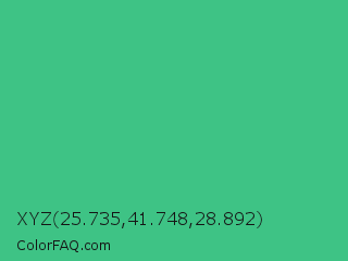 XYZ 25.735,41.748,28.892 Color is a normal green color and the nearest color is Mint #3eb489. Hex code #3ec385 and RGB value is rgb(62,195,133). In RGB color space, this color is composed of 24% red, 76% green, 52% blue, In CMYK color space, this color is composed of 68% cyan, 0% magenta, 32% yellow , 24% black , In HSL color space, this color has a hue angle of 152° , 53% saturation and 50% lightness.