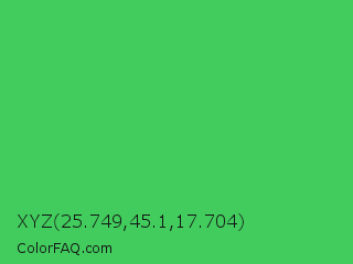 XYZ 25.749,45.1,17.704 Color is a normal green color and the nearest color is UFO Green #3cd070. Hex code #41cc5d and RGB value is rgb(65,204,93). In RGB color space, this color is composed of 25% red, 80% green, 36% blue, In CMYK color space, this color is composed of 68% cyan, 0% magenta, 54% yellow , 20% black , In HSL color space, this color has a hue angle of 132° , 58% saturation and 53% lightness.