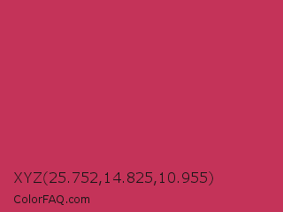 XYZ 25.752,14.825,10.955 Color is a normal rose color and the nearest color is Dingy Dungeon #c53151. Hex code #c43359 and RGB value is rgb(196,51,89). In RGB color space, this color is composed of 77% red, 20% green, 35% blue, In CMYK color space, this color is composed of 0% cyan, 74% magenta, 55% yellow , 23% black , In HSL color space, this color has a hue angle of 344° , 59% saturation and 48% lightness.