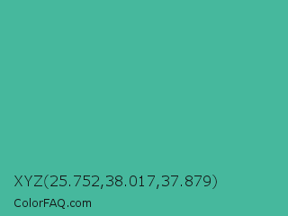 XYZ 25.752,38.017,37.879 Color is a normal cyan color and the nearest color is Ocean Green #48bf91. Hex code #46b89d and RGB value is rgb(70,184,157). In RGB color space, this color is composed of 27% red, 72% green, 62% blue, In CMYK color space, this color is composed of 62% cyan, 0% magenta, 15% yellow , 28% black , In HSL color space, this color has a hue angle of 166° , 45% saturation and 50% lightness.