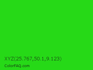XYZ 25.767,50.1,9.123 Color is a normal green color and the nearest color is Lime Green #32cd32. Hex code #26d917 and RGB value is rgb(38,217,23). In RGB color space, this color is composed of 15% red, 85% green, 9% blue, In CMYK color space, this color is composed of 82% cyan, 0% magenta, 89% yellow , 15% black , In HSL color space, this color has a hue angle of 115° , 81% saturation and 47% lightness.