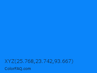 XYZ 25.768,23.742,93.667 Color is a normal blue color and the nearest color is Azure Radiance #007fff. Hex code #0a85fa and RGB value is rgb(10,133,250). In RGB color space, this color is composed of 4% red, 52% green, 98% blue, In CMYK color space, this color is composed of 96% cyan, 47% magenta, 0% yellow , 2% black , In HSL color space, this color has a hue angle of 209° , 96% saturation and 51% lightness.