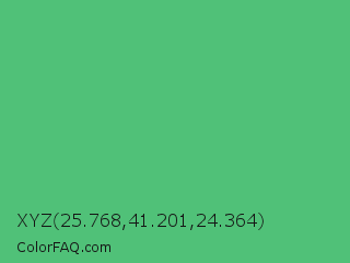 XYZ 25.768,41.201,24.364 Color is a normal green color and the nearest color is Emerald #50c878. Hex code #50c178 and RGB value is rgb(80,193,120). In RGB color space, this color is composed of 31% red, 76% green, 47% blue, In CMYK color space, this color is composed of 59% cyan, 0% magenta, 38% yellow , 24% black , In HSL color space, this color has a hue angle of 141° , 48% saturation and 54% lightness.