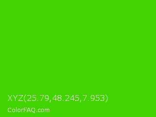 XYZ 25.79,48.245,7.953 Color is a normal green color and the nearest color is Harlequin Green #46cb18. Hex code #42d400 and RGB value is rgb(66,212,0). In RGB color space, this color is composed of 26% red, 83% green, 0% blue, In CMYK color space, this color is composed of 69% cyan, 0% magenta, 100% yellow , 17% black , In HSL color space, this color has a hue angle of 101° , 100% saturation and 42% lightness.