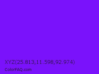 XYZ 25.813,11.598,92.974 Color is a normal violet color and the nearest color is Violet Color Wheel #7f00ff. Hex code #7a12fc and RGB value is rgb(122,18,252). In RGB color space, this color is composed of 48% red, 7% green, 99% blue, In CMYK color space, this color is composed of 52% cyan, 93% magenta, 0% yellow , 1% black , In HSL color space, this color has a hue angle of 267° , 98% saturation and 53% lightness.