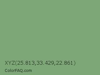 XYZ 25.813,33.429,22.861 Color is a normal green color and the nearest color is Amulet #7b9f80. Hex code #7ea778 and RGB value is rgb(126,167,120). In RGB color space, this color is composed of 49% red, 65% green, 47% blue, In CMYK color space, this color is composed of 25% cyan, 0% magenta, 28% yellow , 35% black , In HSL color space, this color has a hue angle of 112° , 21% saturation and 56% lightness.