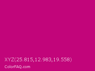 XYZ 25.815,12.983,19.558 Color is a normal magenta color and the nearest color is Red Violet #c71585. Hex code #c2057a and RGB value is rgb(194,5,122). In RGB color space, this color is composed of 76% red, 2% green, 48% blue, In CMYK color space, this color is composed of 0% cyan, 97% magenta, 37% yellow , 24% black , In HSL color space, this color has a hue angle of 323° , 95% saturation and 39% lightness.