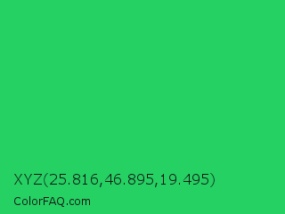 XYZ 25.816,46.895,19.495 Color is a normal green color and the nearest color is UFO Green #3cd070. Hex code #25d163 and RGB value is rgb(37,209,99). In RGB color space, this color is composed of 15% red, 82% green, 39% blue, In CMYK color space, this color is composed of 82% cyan, 0% magenta, 53% yellow , 18% black , In HSL color space, this color has a hue angle of 142° , 70% saturation and 48% lightness.