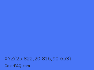 XYZ 25.822,20.816,90.653 Color is a light blue color and the nearest color is Ultramarine Blue #4166f5. Hex code #4875f7 and RGB value is rgb(72,117,247). In RGB color space, this color is composed of 28% red, 46% green, 97% blue, In CMYK color space, this color is composed of 71% cyan, 53% magenta, 0% yellow , 3% black , In HSL color space, this color has a hue angle of 225° , 92% saturation and 63% lightness.