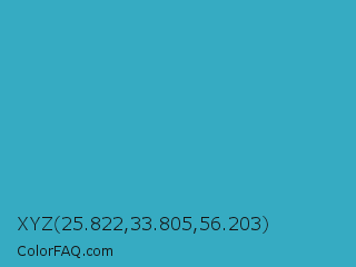 XYZ 25.822,33.805,56.203 Color is a normal cyan color and the nearest color is Pelorous #3eabbf. Hex code #36abc2 and RGB value is rgb(54,171,194). In RGB color space, this color is composed of 21% red, 67% green, 76% blue, In CMYK color space, this color is composed of 72% cyan, 12% magenta, 0% yellow , 24% black , In HSL color space, this color has a hue angle of 190° , 56% saturation and 49% lightness.