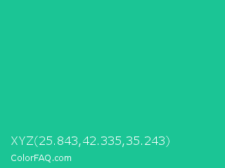 XYZ 25.843,42.335,35.243 Color is a normal green color and the nearest color is Mountain Meadow Crayola #1ab385. Hex code #1bc595 and RGB value is rgb(27,197,149). In RGB color space, this color is composed of 11% red, 77% green, 58% blue, In CMYK color space, this color is composed of 86% cyan, 0% magenta, 24% yellow , 23% black , In HSL color space, this color has a hue angle of 163° , 76% saturation and 44% lightness.