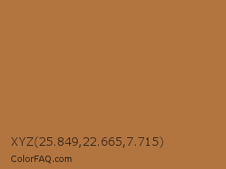 XYZ 25.849,22.665,7.715 Color is a normal orange color and the nearest color is Copper #b87333. Hex code #b3753f and RGB value is rgb(179,117,63). In RGB color space, this color is composed of 70% red, 46% green, 25% blue, In CMYK color space, this color is composed of 0% cyan, 35% magenta, 65% yellow , 30% black , In HSL color space, this color has a hue angle of 28° , 48% saturation and 47% lightness.