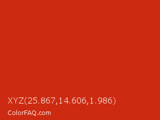 XYZ 25.867,14.606,1.986 Color is a normal red color and the nearest color is Thunderbird #c02b18. Hex code #cc2b11 and RGB value is rgb(204,43,17). In RGB color space, this color is composed of 80% red, 17% green, 7% blue, In CMYK color space, this color is composed of 0% cyan, 79% magenta, 92% yellow , 20% black , In HSL color space, this color has a hue angle of 8° , 85% saturation and 43% lightness.