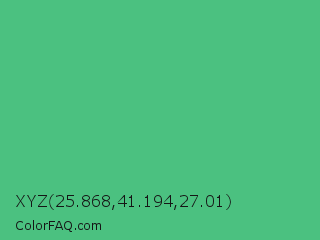 XYZ 25.868,41.194,27.01 Color is a normal green color and the nearest color is Emerald #50c878. Hex code #4bc180 and RGB value is rgb(75,193,128). In RGB color space, this color is composed of 29% red, 76% green, 50% blue, In CMYK color space, this color is composed of 61% cyan, 0% magenta, 34% yellow , 24% black , In HSL color space, this color has a hue angle of 147° , 49% saturation and 53% lightness.
