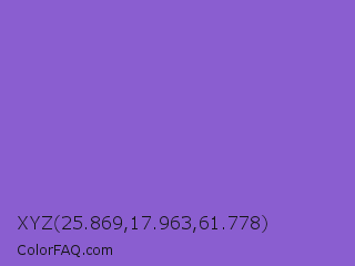 XYZ 25.869,17.963,61.778 Color is a normal violet color and the nearest color is Amethyst #9966cc. Hex code #8a5ed0 and RGB value is rgb(138,94,208). In RGB color space, this color is composed of 54% red, 37% green, 82% blue, In CMYK color space, this color is composed of 34% cyan, 55% magenta, 0% yellow , 18% black , In HSL color space, this color has a hue angle of 263° , 55% saturation and 59% lightness.