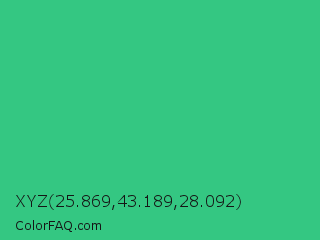 XYZ 25.869,43.189,28.092 Color is a normal green color and the nearest color is Mountain Meadow #30ba8f. Hex code #34c782 and RGB value is rgb(52,199,130). In RGB color space, this color is composed of 20% red, 78% green, 51% blue, In CMYK color space, this color is composed of 74% cyan, 0% magenta, 35% yellow , 22% black , In HSL color space, this color has a hue angle of 152° , 59% saturation and 49% lightness.