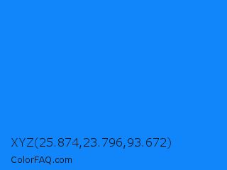 XYZ 25.874,23.796,93.672 Color is a normal blue color and the nearest color is Dodger Blue #1e90ff. Hex code #1185fa and RGB value is rgb(17,133,250). In RGB color space, this color is composed of 7% red, 52% green, 98% blue, In CMYK color space, this color is composed of 93% cyan, 47% magenta, 0% yellow , 2% black , In HSL color space, this color has a hue angle of 210° , 96% saturation and 52% lightness.
