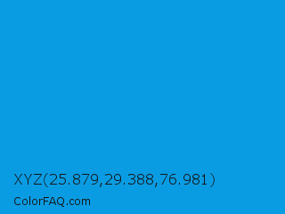XYZ 25.879,29.388,76.981 Color is a normal blue color and the nearest color is Cerulean #02a4d3. Hex code #0a9ce3 and RGB value is rgb(10,156,227). In RGB color space, this color is composed of 4% red, 61% green, 89% blue, In CMYK color space, this color is composed of 96% cyan, 31% magenta, 0% yellow , 11% black , In HSL color space, this color has a hue angle of 200° , 92% saturation and 46% lightness.