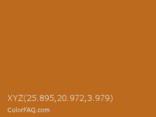 XYZ 25.895,20.972,3.979 Color is a normal orange color and the nearest color is Bourbon #ba6f1e. Hex code #bb6a1f and RGB value is rgb(187,106,31). In RGB color space, this color is composed of 73% red, 42% green, 12% blue, In CMYK color space, this color is composed of 0% cyan, 43% magenta, 83% yellow , 27% black , In HSL color space, this color has a hue angle of 29° , 72% saturation and 43% lightness.