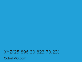 XYZ 25.896,30.823,70.23 Color is a normal blue color and the nearest color is Battery Charged Blue #1dacd6. Hex code #21a1d9 and RGB value is rgb(33,161,217). In RGB color space, this color is composed of 13% red, 63% green, 85% blue, In CMYK color space, this color is composed of 85% cyan, 26% magenta, 0% yellow , 15% black , In HSL color space, this color has a hue angle of 198° , 74% saturation and 49% lightness.