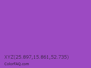 XYZ 25.897,15.861,52.735 Color is a normal purple color and the nearest color is Deep Lilac #9955bb. Hex code #9c4ac2 and RGB value is rgb(156,74,194). In RGB color space, this color is composed of 61% red, 29% green, 76% blue, In CMYK color space, this color is composed of 20% cyan, 62% magenta, 0% yellow , 24% black , In HSL color space, this color has a hue angle of 281° , 50% saturation and 53% lightness.