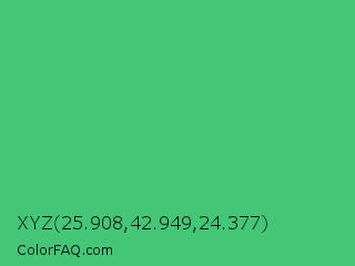 XYZ 25.908,42.949,24.377 Color is a normal green color and the nearest color is Emerald #50c878. Hex code #44c677 and RGB value is rgb(68,198,119). In RGB color space, this color is composed of 27% red, 78% green, 47% blue, In CMYK color space, this color is composed of 66% cyan, 0% magenta, 40% yellow , 22% black , In HSL color space, this color has a hue angle of 144° , 53% saturation and 52% lightness.